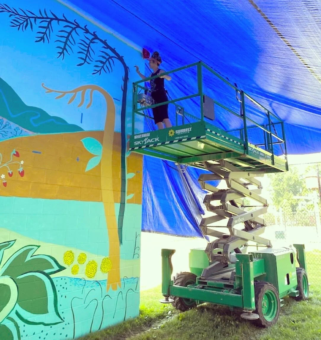 The mural will be painted in my style, which often relies on the combination of flat shapes, meandering lines and vibrant colors to create dynamic, often lively, landscapes. In my paintings, I am not trying to capture an exact likeness of any one place, but rather reflect the spirit of aliveness found and experienced when surrounded by living, growing things like trees, flowers, grasses and wildlife.
